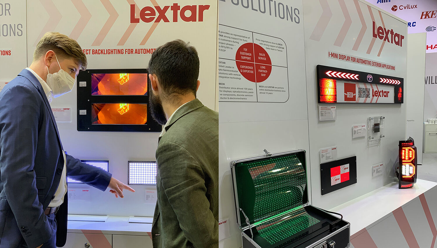 Our long-standing partner Lextar also impressed with its technical innovations in the automotive sector. As a partner exhibitor of BECK, the Taiwanese LED and semiconductor manufacturer showed various prototypes from the four product areas "Interior", "Exterior", "Direct Display Backlighting" and "Sensing Applications". A special highlight was a transparent automotive micro-LED display for the "Interior" area. Here, micro-LEDs are installed directly on a glass substrate, which are a hundred times smaller than conventional or mini-LEDs.