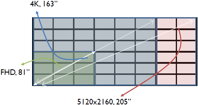 So können sich beispielsweise Videowalls aus 3x3 Cabinets zu einer Full-HD Auflösung bei einer gigantischen Bildschirmdiagonale von 81“ (2,05m), 4K Auflösung bei 163“ (4,14m) oder noch mehr zusammenführen (Abbildung 6).