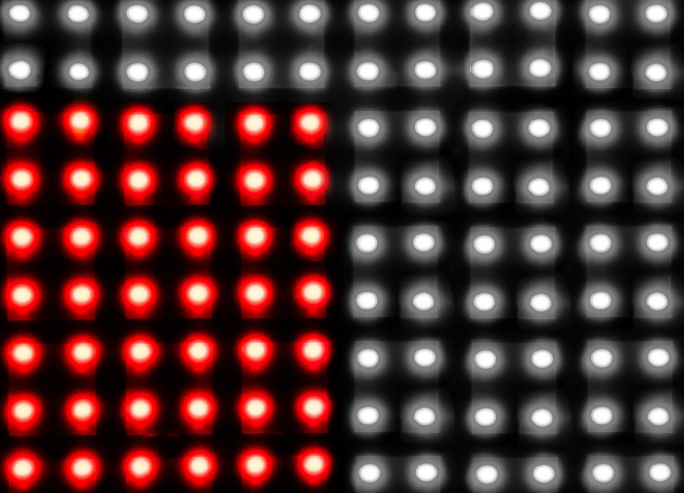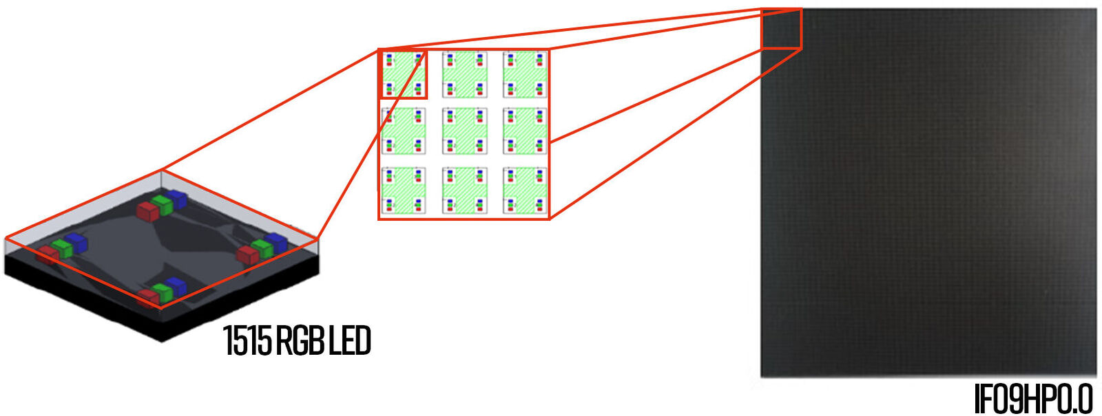 Als Spezialist für Multicolor LEDs bringt Yenrich seine Kompetenz ein und verbaut vier gleiche Mini RGB-LEDs in ein Gehäuse (4in1) – wodurch sich der Pitch (Abstand zwischen den Pixeln) unter 1 mm bringen lässt!